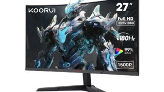 KOORUI 27E6CA 180Hz湾曲ゲーミングモニターの徹底解説。27インチ1500R VAパネル、DCI-P3 90%色域、1ms応答でAI作業とゲームを両立。ChatGPT・Midjourney使用時の生産性向上、FreeSync対応で3万円台の高コスパモデルを詳細レビュー。