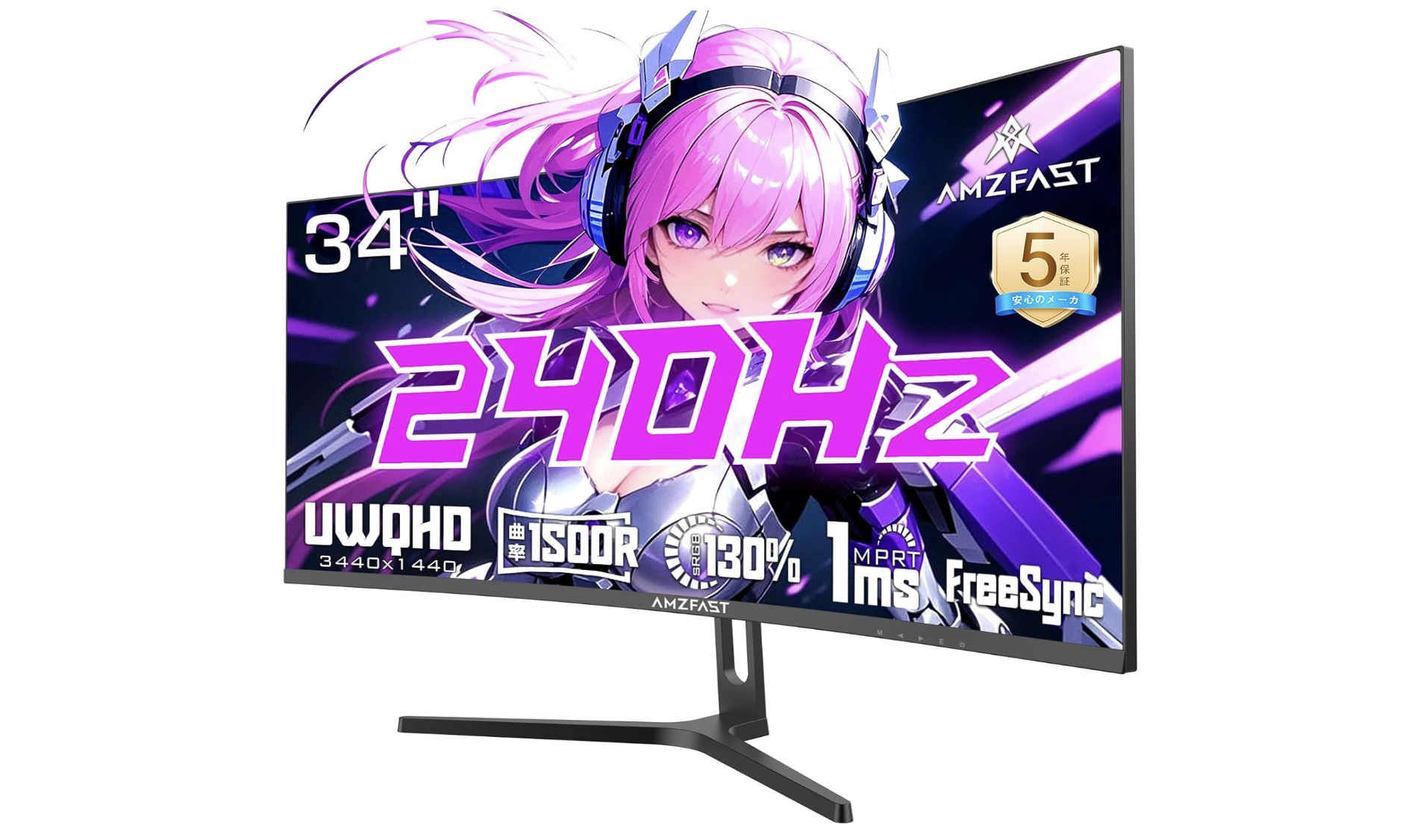 Amzfast AMZG34C5Q Proは、240Hz×WQHD×34インチ曲面という黄金スペックを、5年保証付きで提供するコストパフォーマンスに優れたモニターです。