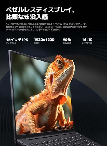 AI時代の作業スタイルは、「複数ウィンドウの同時表示」が基本です。CHUWI CoreBook Plusの16インチディスプレイ(1920×1200解像度)は、従来の16:9より縦幅が広い16:10アスペクト比を採用。