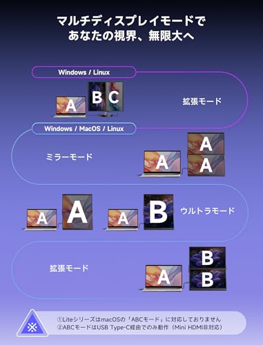 FlipGo Liteは、Windows搭載ノートPCに最適化されていますが、Mini-HDMI接続によりMacBookなど他のデバイスにも対応しています。ただし、一部の表示モード(Duo Views)はWindows専用機能のため、使用するデバイスと目的に応じた確認が必要です。