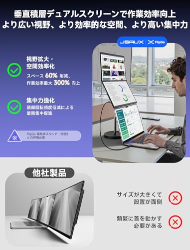 | 機能 | JSAUX FlipGo Lite | 一般的なポータブルモニター | 競合デュアルモニター |