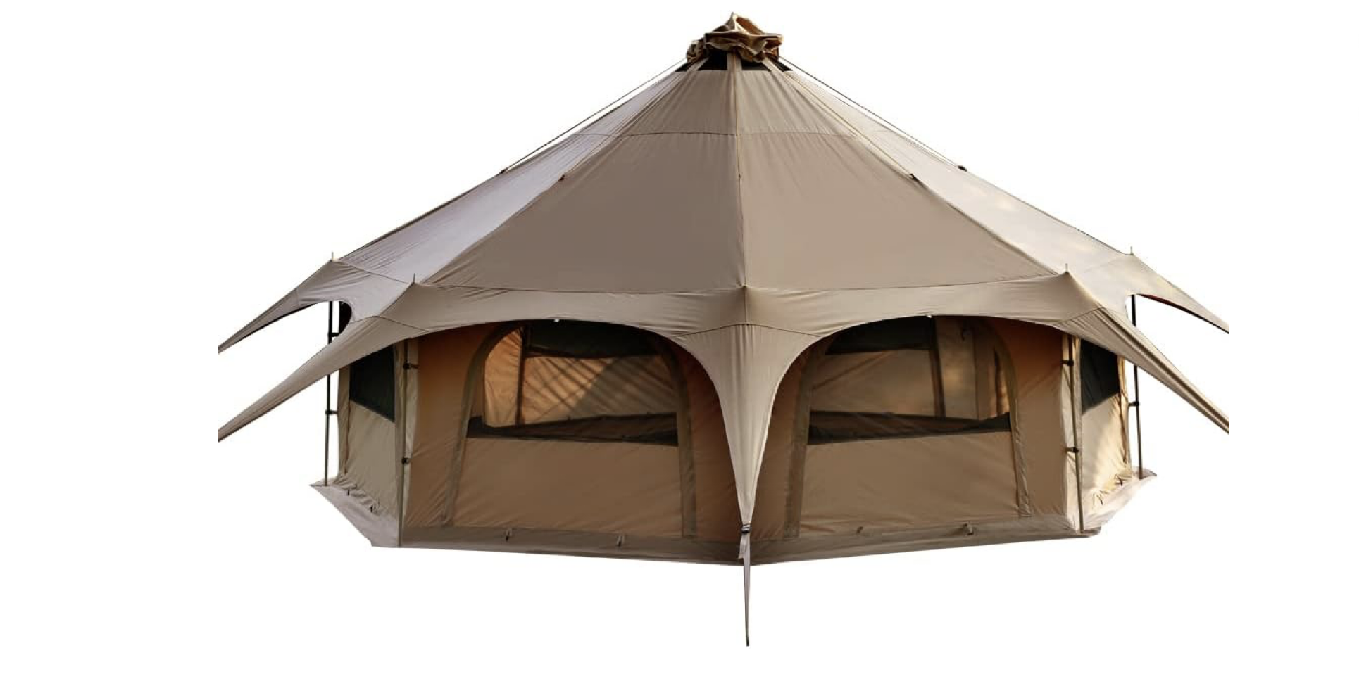 TOMOUNT ベルテント 5m TCには、8つのメッシュ窓とドアがあります。この設計が、このテントの快適性を大きく高めています。