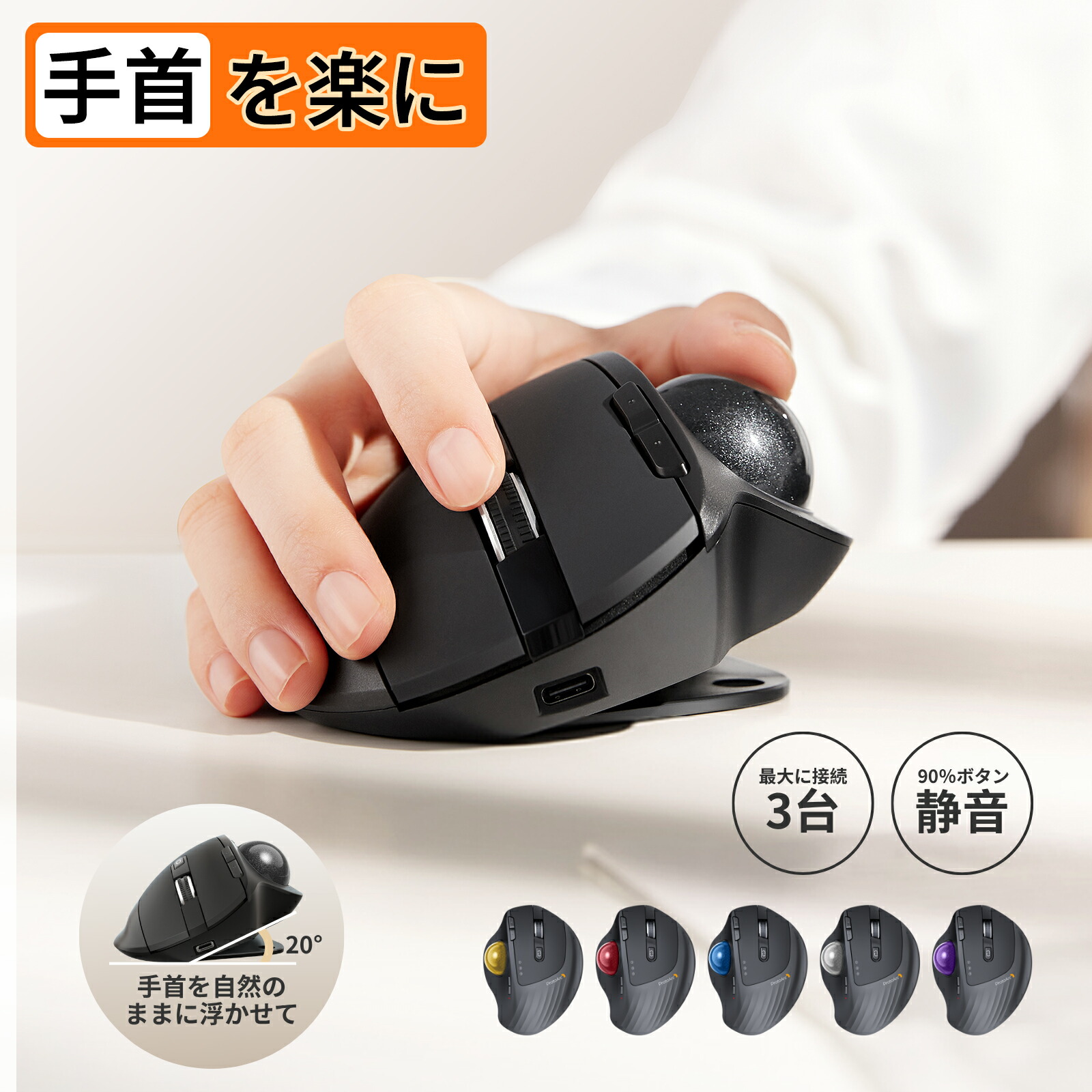独自の20度傾斜調整機能を備え、手首への負担を最小限に抑える設計を採用。34mmの大型トラックボールは、スムーズな操作感を実現し、長時間の使用でも疲れにくい設計となっています。