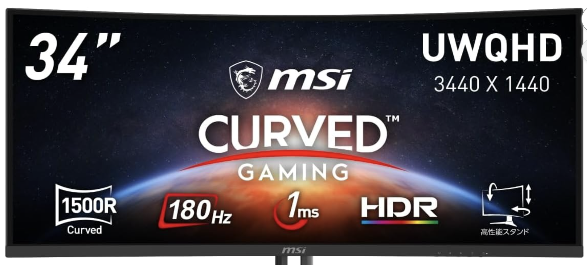 34インチの大画面を活かすため、1,500Rの湾曲率を採用。これは人間の視野に最も近い曲率とされ、以下の効果をもたらします: