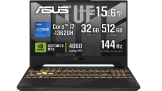 ASUS TUF Gaming F15(RTX 4060搭載)のレビュー記事。Core i7-13620H、32GBメモリ、144Hz液晶でゲーミングと動画編集を両立。AI画像生成にも対応する高性能ノートPCの魅力を徹底解説。クリエイター・ゲーマー必見のコスパ最強マシン。